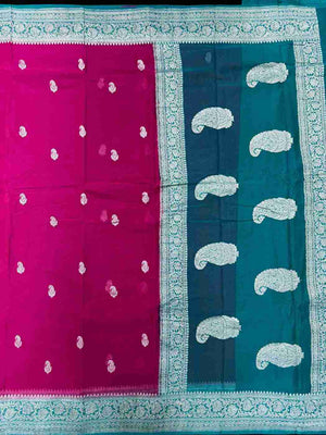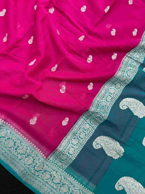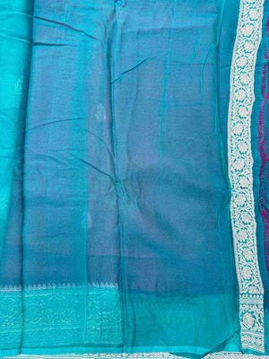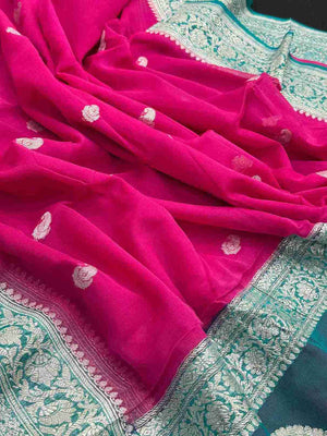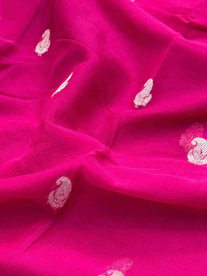 Expertly crafted from pure Khaddi chiffon, this Banarasi saree is a must-have for any traditional wardrobe. With its intricate woven design and luxurious feel, it is the perfect blend of elegance and comfort. Elevate any occasion with this exquisite saree and make a statement wherever you go. With its intricate woven design and luxurious feel, this expertly crafted Banarasi saree is the perfect blend of elegance and comfort. Made from pure Khaddi chiffon, it is a must-have for any traditional wardrobe. Impress others and express your unique style with this exquisite saree at any event or function.