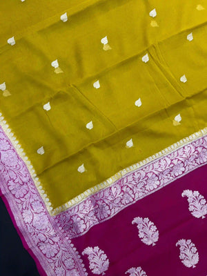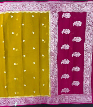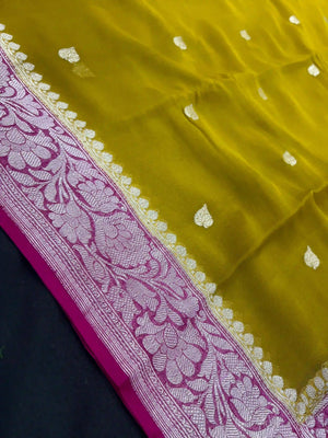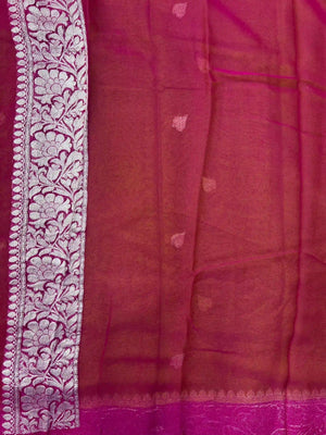 Expertly crafted from pure Khaddi chiffon, this Banarasi saree is a must-have for any traditional wardrobe. With its intricate woven design and luxurious feel, it is the perfect blend of elegance and comfort. Elevate any occasion with this exquisite saree and make a statement wherever you go. With its intricate woven design and luxurious feel, this expertly crafted Banarasi saree is the perfect blend of elegance and comfort. Made from pure Khaddi chiffon, it is a must-have for any traditional wardrobe. Impress others and express your unique style with this exquisite saree at any event or function.