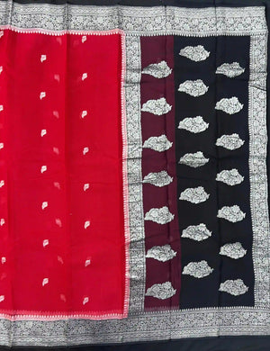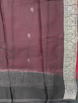 Expertly crafted from pure Khaddi chiffon, this Banarasi saree is a must-have for any traditional wardrobe. With its intricate woven design and luxurious feel, it is the perfect blend of elegance and comfort. Elevate any occasion with this exquisite saree and make a statement wherever you go. With its intricate woven design and luxurious feel, this expertly crafted Banarasi saree is the perfect blend of elegance and comfort. Made from pure Khaddi chiffon, it is a must-have for any traditional wardrobe. Impress others and express your unique style with this exquisite saree at any event or function.