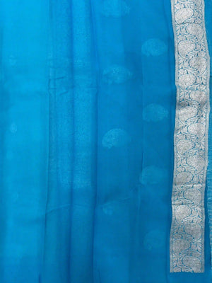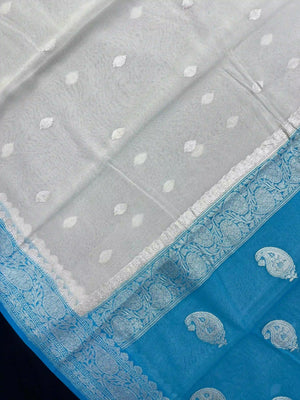 Expertly crafted from pure Khaddi chiffon, this Banarasi saree is a must-have for any traditional wardrobe. With its intricate woven design and luxurious feel, it is the perfect blend of elegance and comfort. Elevate any occasion with this exquisite saree and make a statement wherever you go. With its intricate woven design and luxurious feel, this expertly crafted Banarasi saree is the perfect blend of elegance and comfort. Made from pure Khaddi chiffon, it is a must-have for any traditional wardrobe. Impress others and express your unique style with this exquisite saree at any event or function.