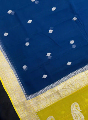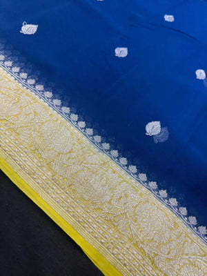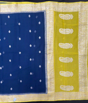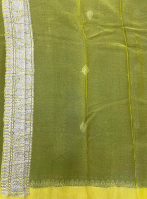 Expertly crafted from pure Khaddi chiffon, this Banarasi saree is a must-have for any traditional wardrobe. With its intricate woven design and luxurious feel, it is the perfect blend of elegance and comfort. Elevate any occasion with this exquisite saree and make a statement wherever you go. With its intricate woven design and luxurious feel, this expertly crafted Banarasi saree is the perfect blend of elegance and comfort. Made from pure Khaddi chiffon, it is a must-have for any traditional wardrobe. Impress others and express your unique style with this exquisite saree at any event or function.