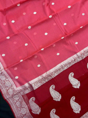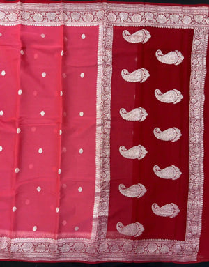 Expertly crafted from pure Khaddi chiffon, this Banarasi saree is a must-have for any traditional wardrobe. With its intricate woven design and luxurious feel, it is the perfect blend of elegance and comfort. Elevate any occasion with this exquisite saree and make a statement wherever you go. With its intricate woven design and luxurious feel, this expertly crafted Banarasi saree is the perfect blend of elegance and comfort. Made from pure Khaddi chiffon, it is a must-have for any traditional wardrobe. Impress others and express your unique style with this exquisite saree at any event or function.