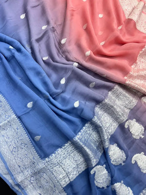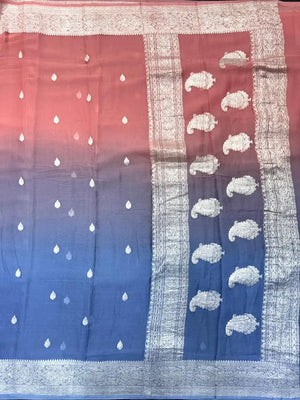 Expertly crafted from pure Khaddi chiffon, this Banarasi saree is a must-have for any traditional wardrobe. With its intricate woven design and luxurious feel, it is the perfect blend of elegance and comfort. Elevate any occasion with this exquisite saree and make a statement wherever you go. With its intricate woven design and luxurious feel, this expertly crafted Banarasi saree is the perfect blend of elegance and comfort. Made from pure Khaddi chiffon, it is a must-have for any traditional wardrobe. Impress others and express your unique style with this exquisite saree at any event or function.