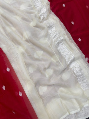 Expertly crafted from pure Khaddi chiffon saree , this Banarasi saree is a must-have for any traditional wardrobe. With its intricate woven design and luxurious feel, it is the perfect blend of elegance and comfort. Elevate any occasion with this exquisite saree and make a statement wherever you go. With its intricate woven design and luxurious feel, this expertly crafted Banarasi saree is the perfect blend of elegance and comfort. Made from pure Khaddi chiffon, it is a must-have for any traditional wardrobe. Impress others and express your unique style with this exquisite saree at any event or function.