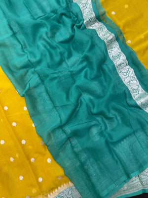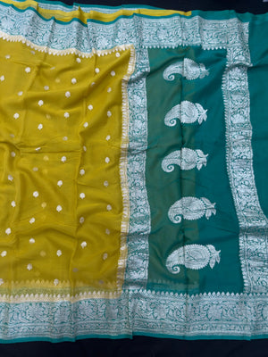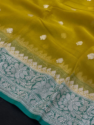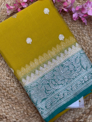Expertly crafted from pure Khaddi chiffon saree , this Banarasi saree is a must-have for any traditional wardrobe. With its intricate woven design and luxurious feel, it is the perfect blend of elegance and comfort. Elevate any occasion with this exquisite saree and make a statement wherever you go. With its intricate woven design and luxurious feel, this expertly crafted Banarasi saree is the perfect blend of elegance and comfort. Made from pure Khaddi chiffon, it is a must-have for any traditional wardrobe.Impress others and express your unique style with this exquisite saree at any event or function