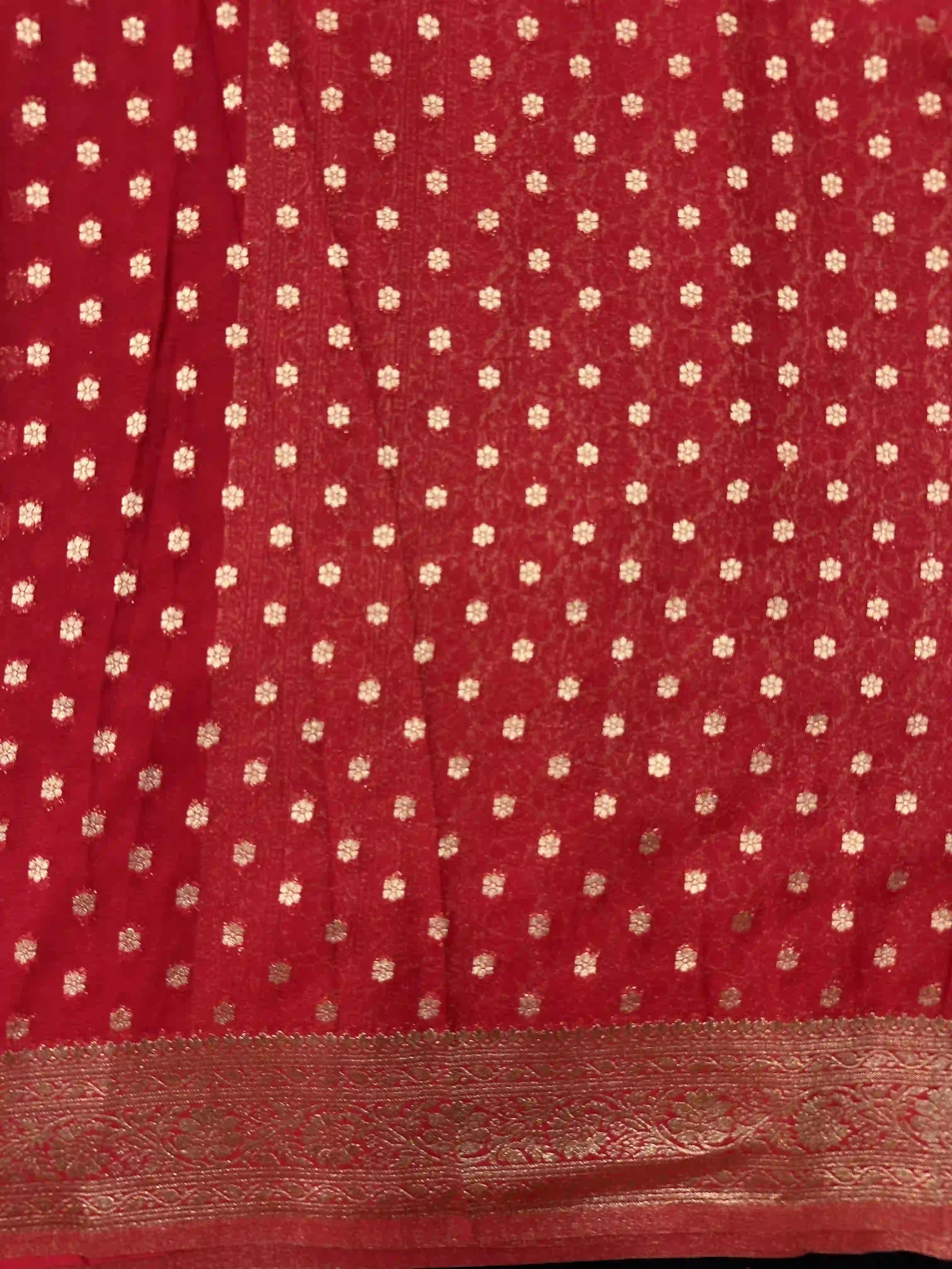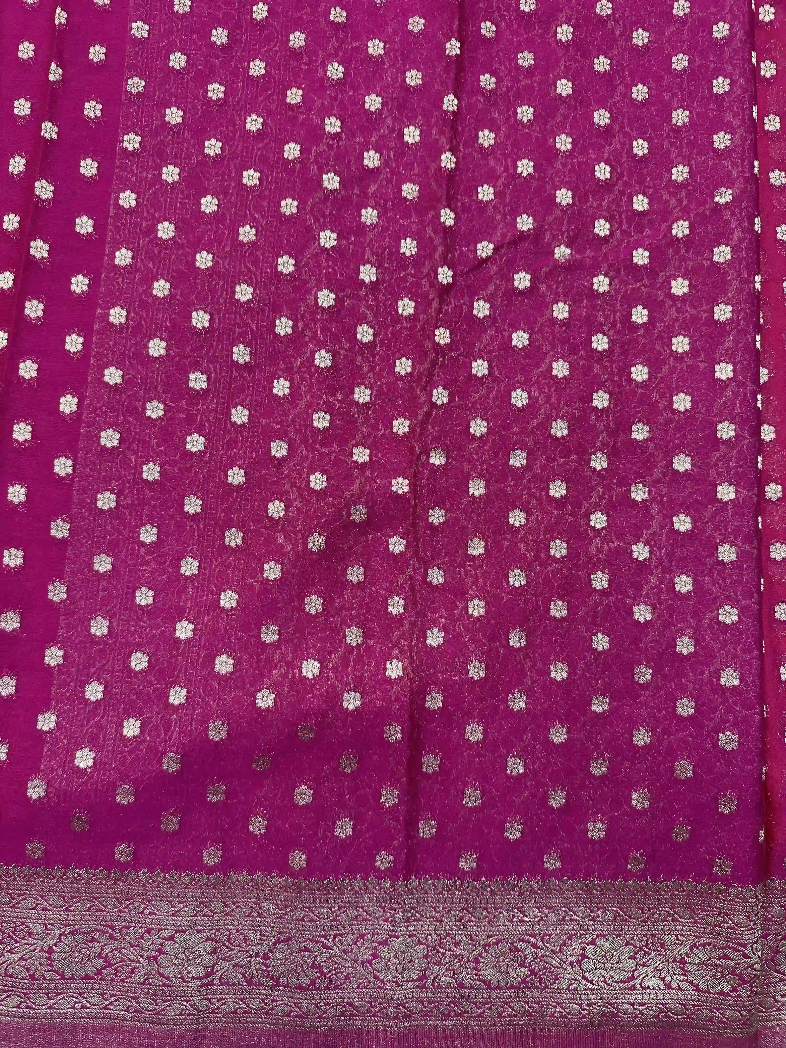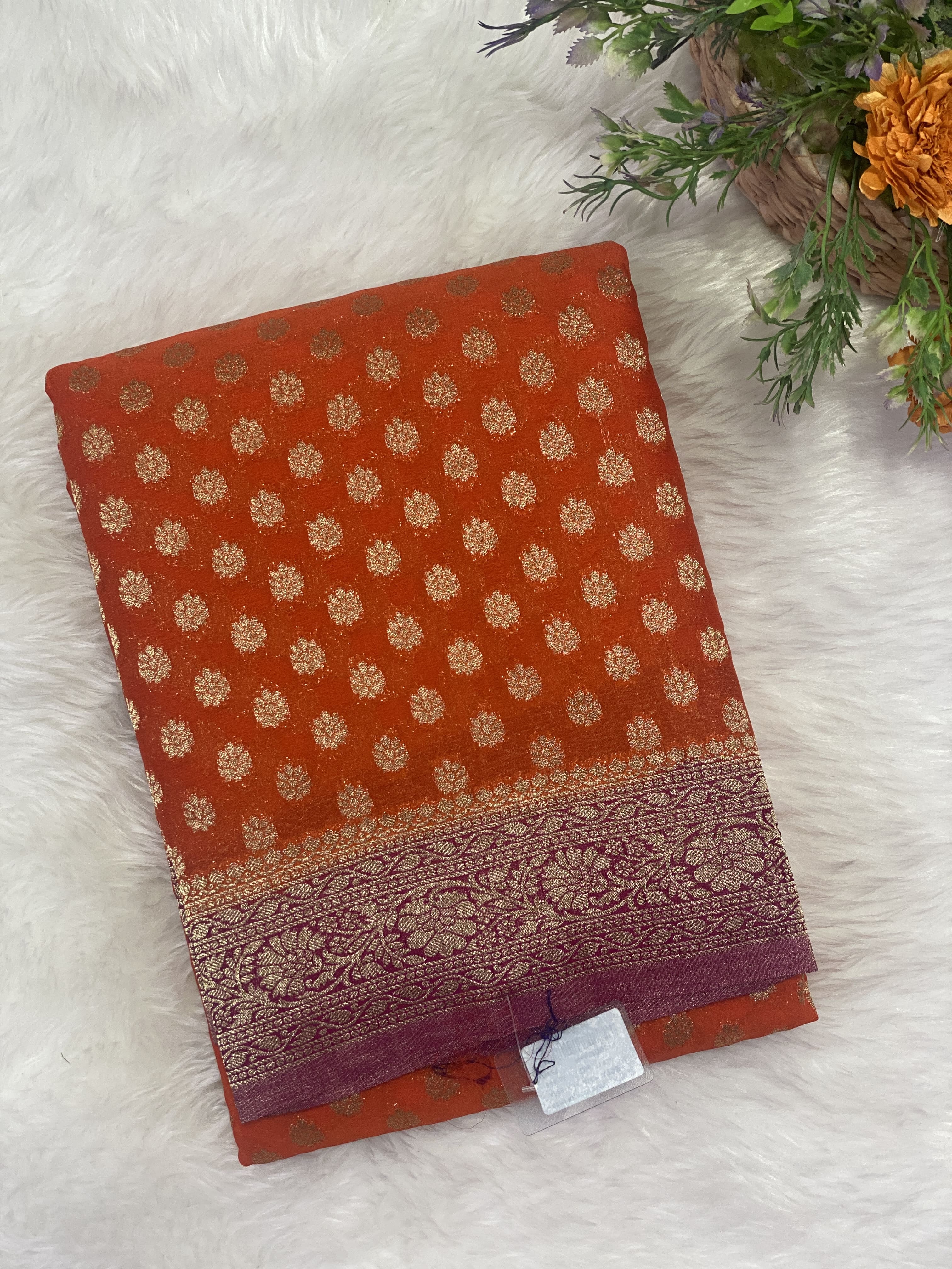 Make a statement with this eye-catching Banarasi georgette saree! Designed with an all-over zari butti in an eye-popping combo of orange and rani pink, you'll look vibrant and gorgeous while you flaunt your style. Go ahead, show 'em who's boss! Elevate your fashion game with the stunning Banarasi Semi Khaddi Butti Georgette Saree. With its eye-catching combination of orange and rani pink and intricate zari butti design, you'll turn heads and make a bold statement. This saree is perfect for anyone looking to add a touch of vibrancy and glamour to their wardrobe.