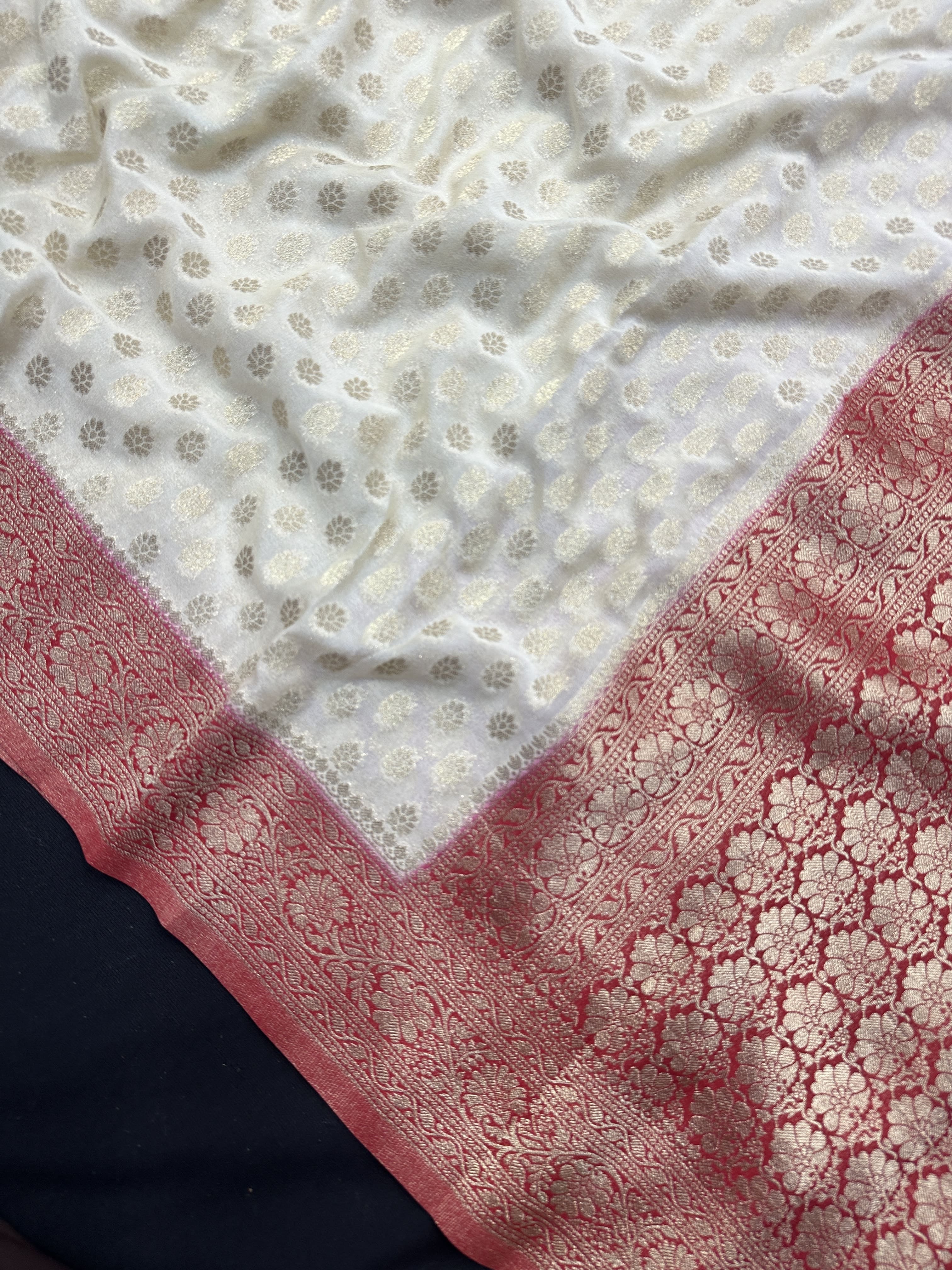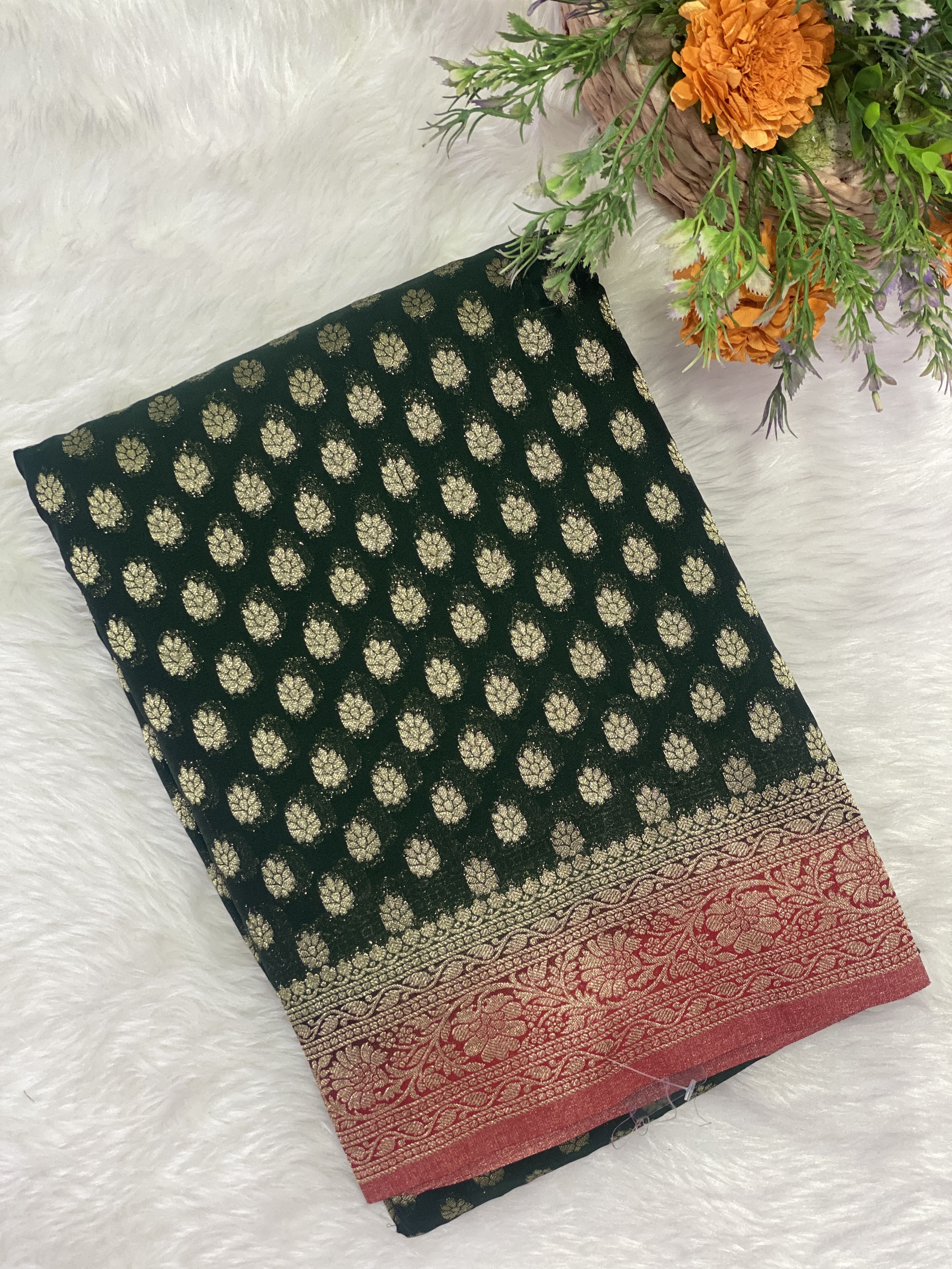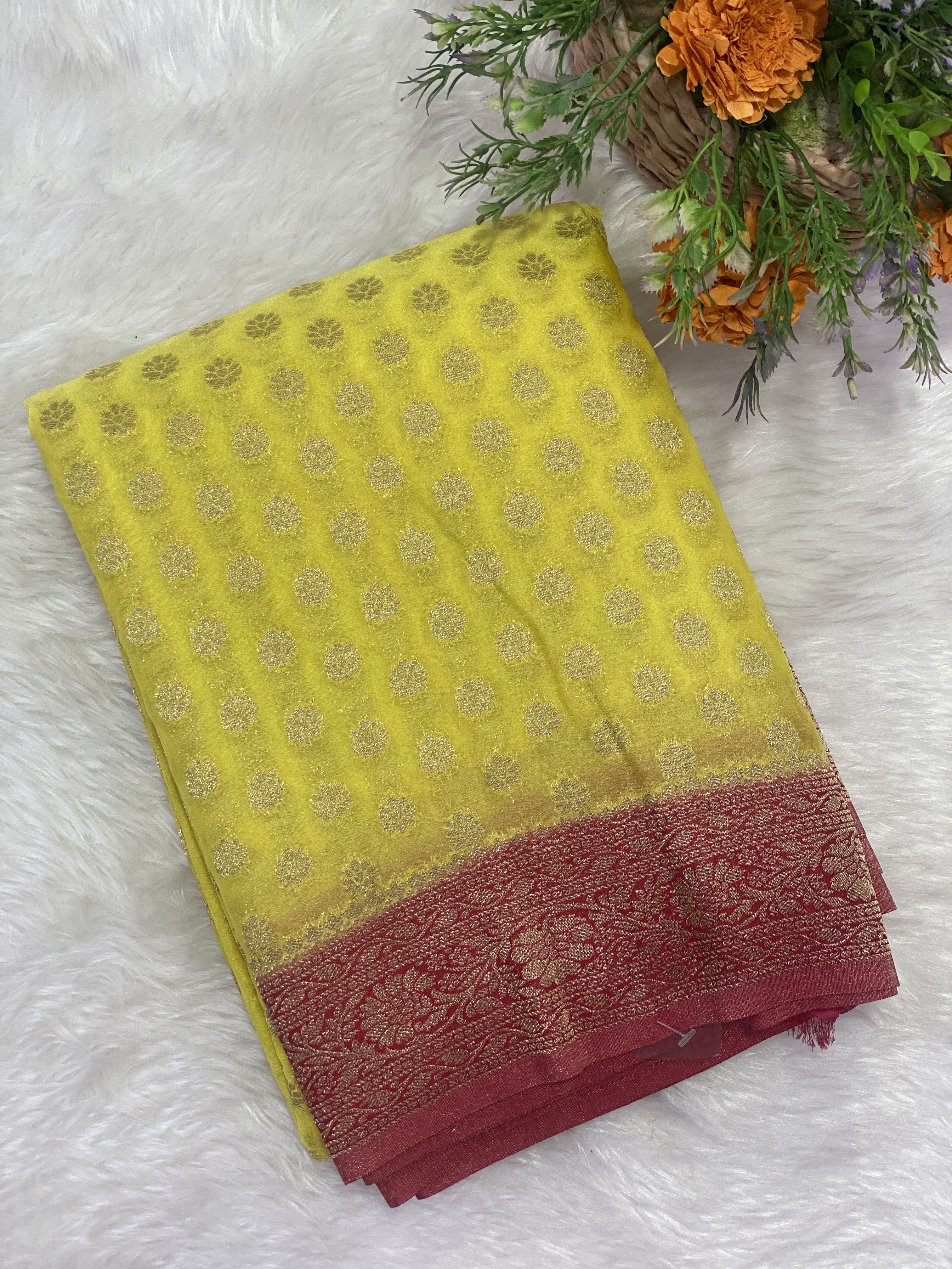 Make a statement with this eye-catching Banarasi georgette saree! Designed with an all-over zari butti in an eye-popping combo of orange and rani pink, you'll look vibrant and gorgeous while you flaunt your style. Go ahead, show 'em who's boss! Elevate your fashion game with the stunning Banarasi Semi Khaddi Butti Georgette Saree. With its eye-catching combination of orange and rani pink and intricate zari butti design, you'll turn heads and make a bold statement. This saree is perfect for anyone looking to add a touch of vibrancy and glamour to their wardrobe.