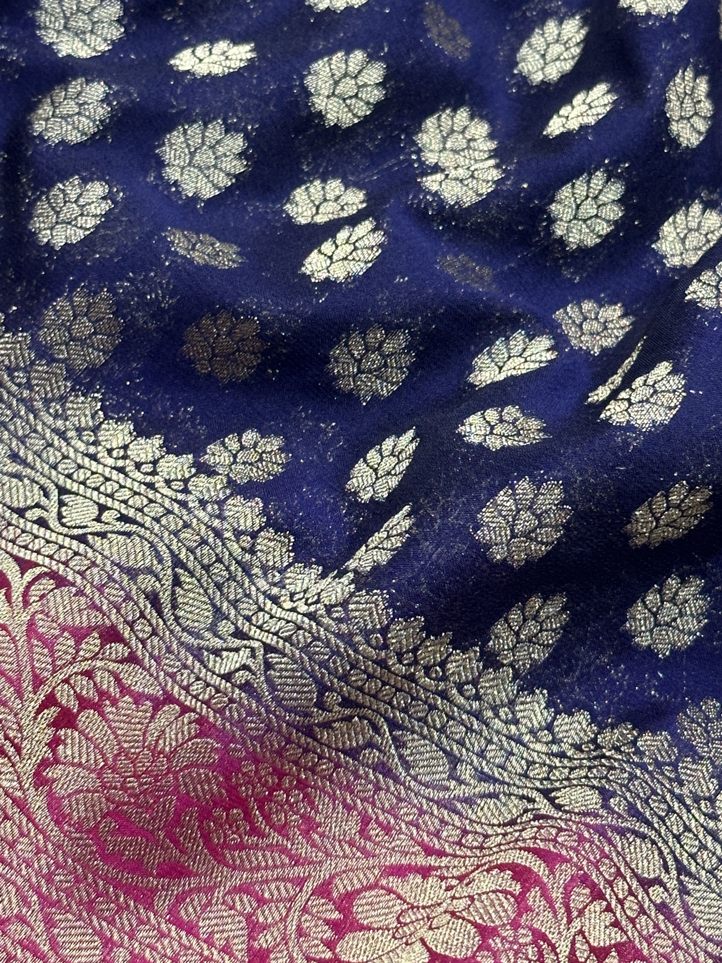 This Banarasi Semi Khaddi Georgette Saree is for those who can't be tamed! The navy blue and rani pink combination make an enchanting style statement and its all-over zari butti will leave you wonderstruck! Show it off and rule the night! With its striking navy blue and rani pink combination and intricate all-over zari butti detailing, this Banarasi Semi Khaddi Georgette Saree is bound to make a statement. Perfect for any occasion, this saree is sure to leave others in awe of your impeccable style.