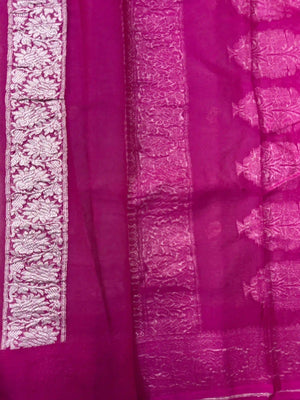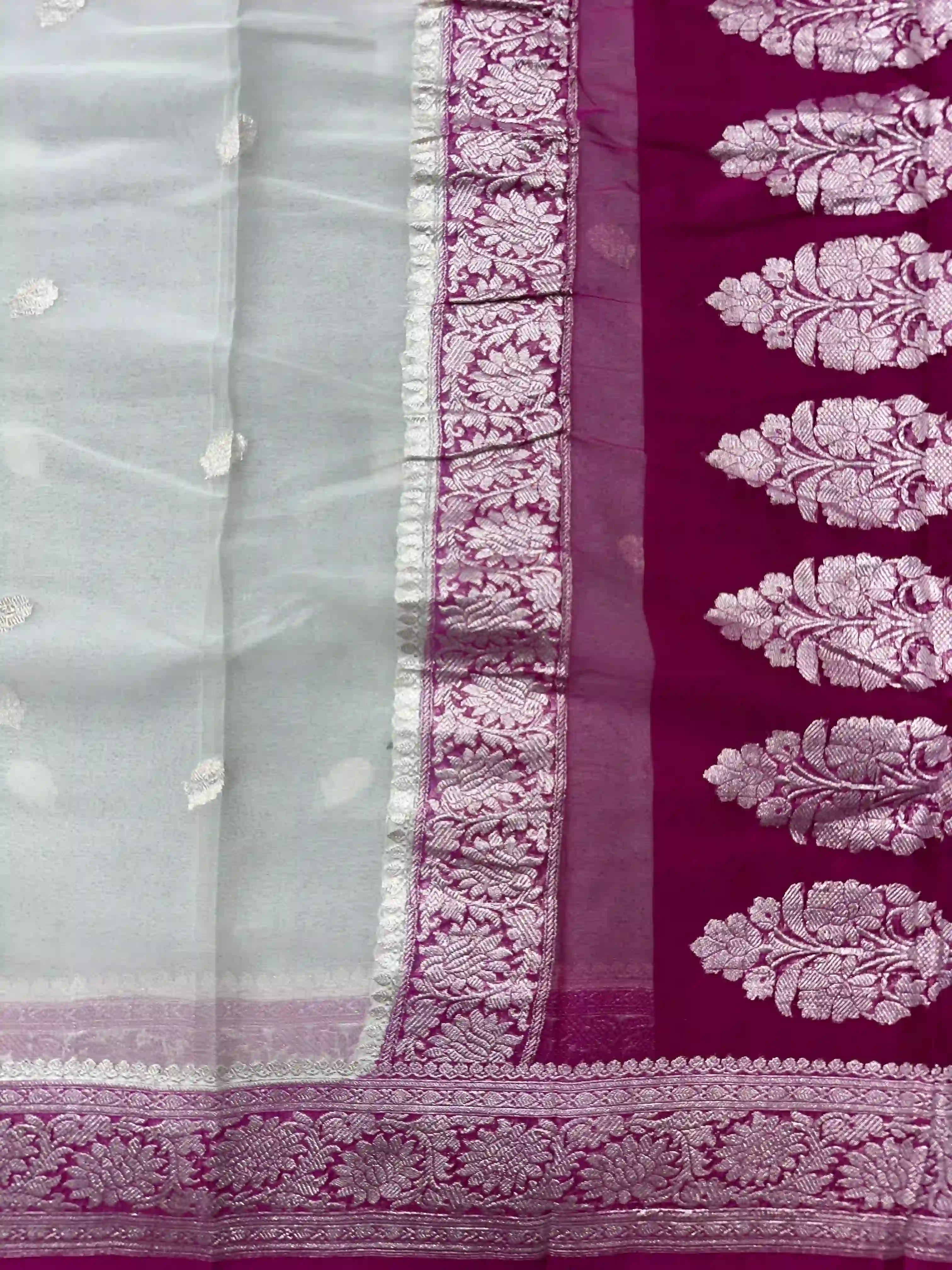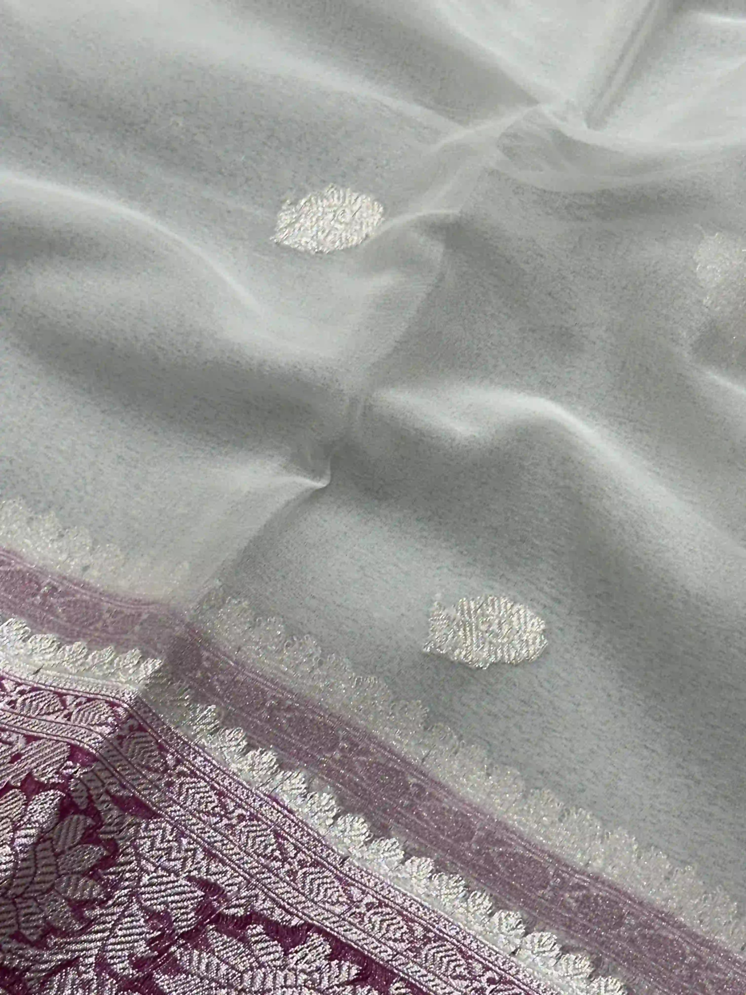 This exquisite Banarasi Saree is crafted from pure Khaddi Chiffon, featuring a timeless Silver Zari design in a delightful Purple colour. Finished with a contrast Mustard Yellow Blouse and Pallu, it is a stunning piece for any occasion. Designed with exceptional quality and attention to detail, this Banarasi Saree is a luxurious choice for any special occasion. The combination of pure Khaddi Chiffon and timeless Silver Zari accents will add a touch of sophistication to any look.