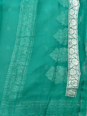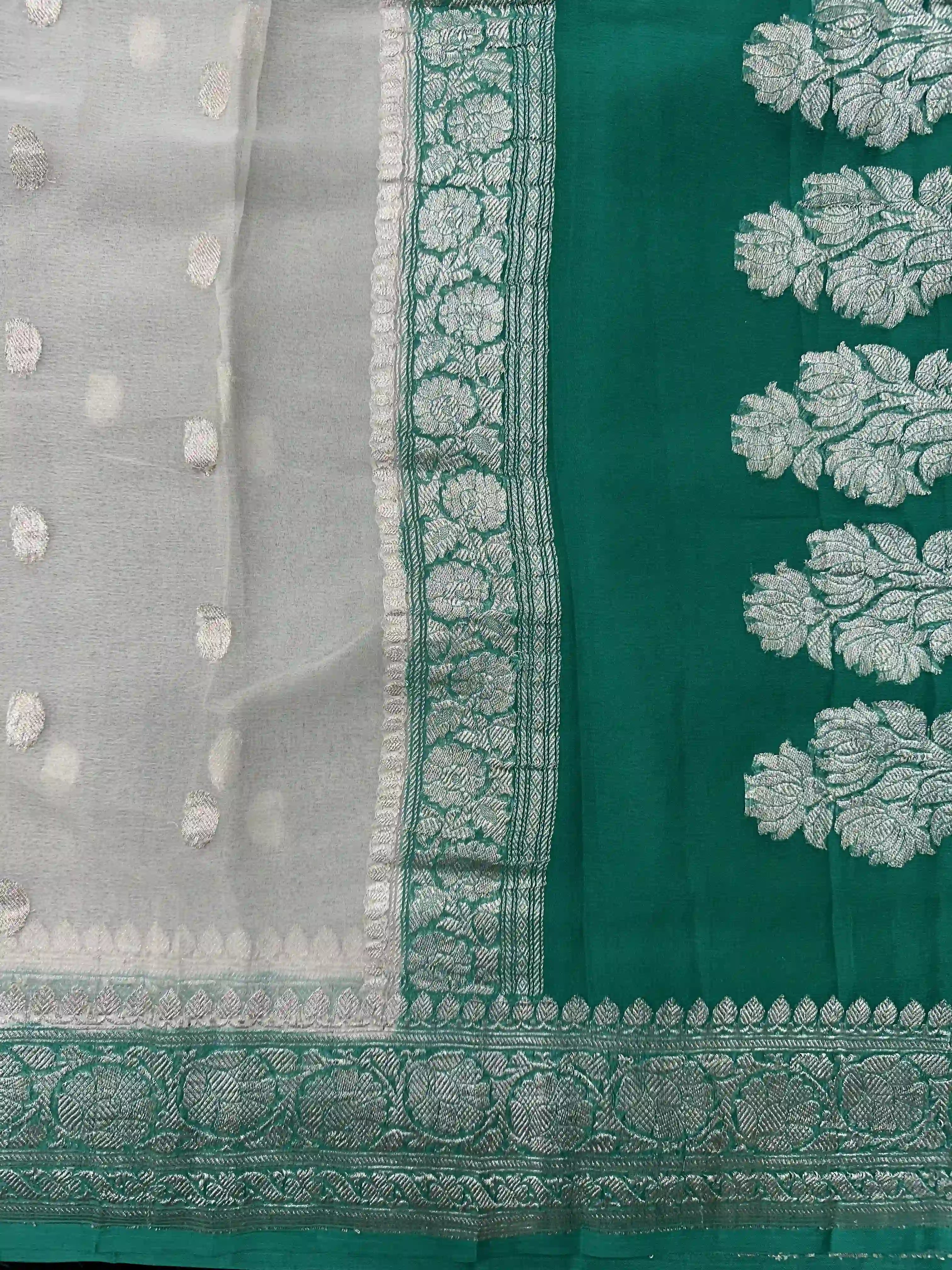 This exquisite Banarasi Saree is crafted from pure Khaddi Chiffon, featuring a timeless Silver Zari design in a delightful Purple colour. Finished with a contrast Mustard Yellow Blouse and Pallu, it is a stunning piece for any occasion. Designed with exceptional quality and attention to detail, this Banarasi Saree is a luxurious choice for any special occasion. The combination of pure Khaddi Chiffon and timeless Silver Zari accents will add a touch of sophistication to any look.