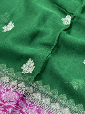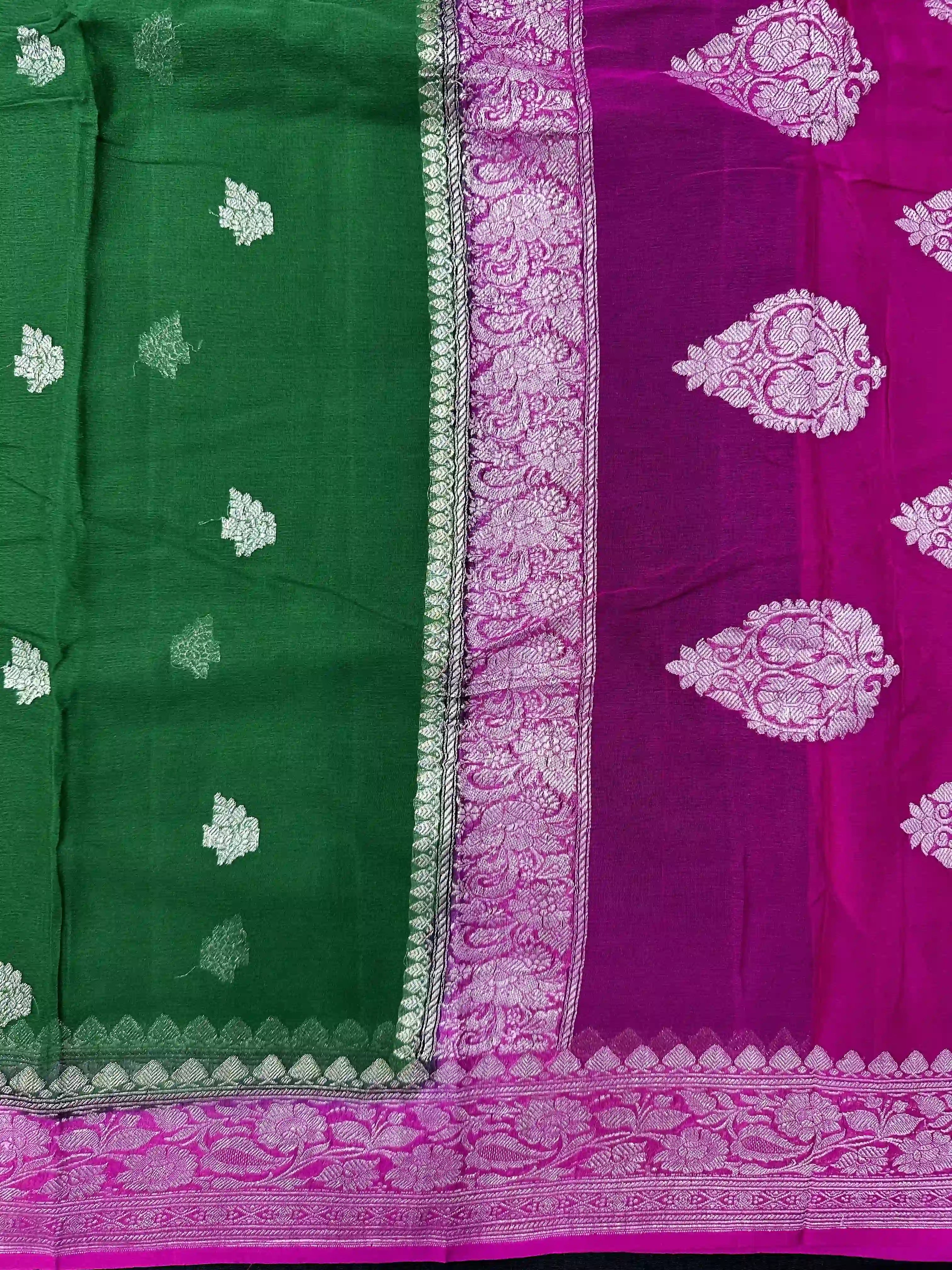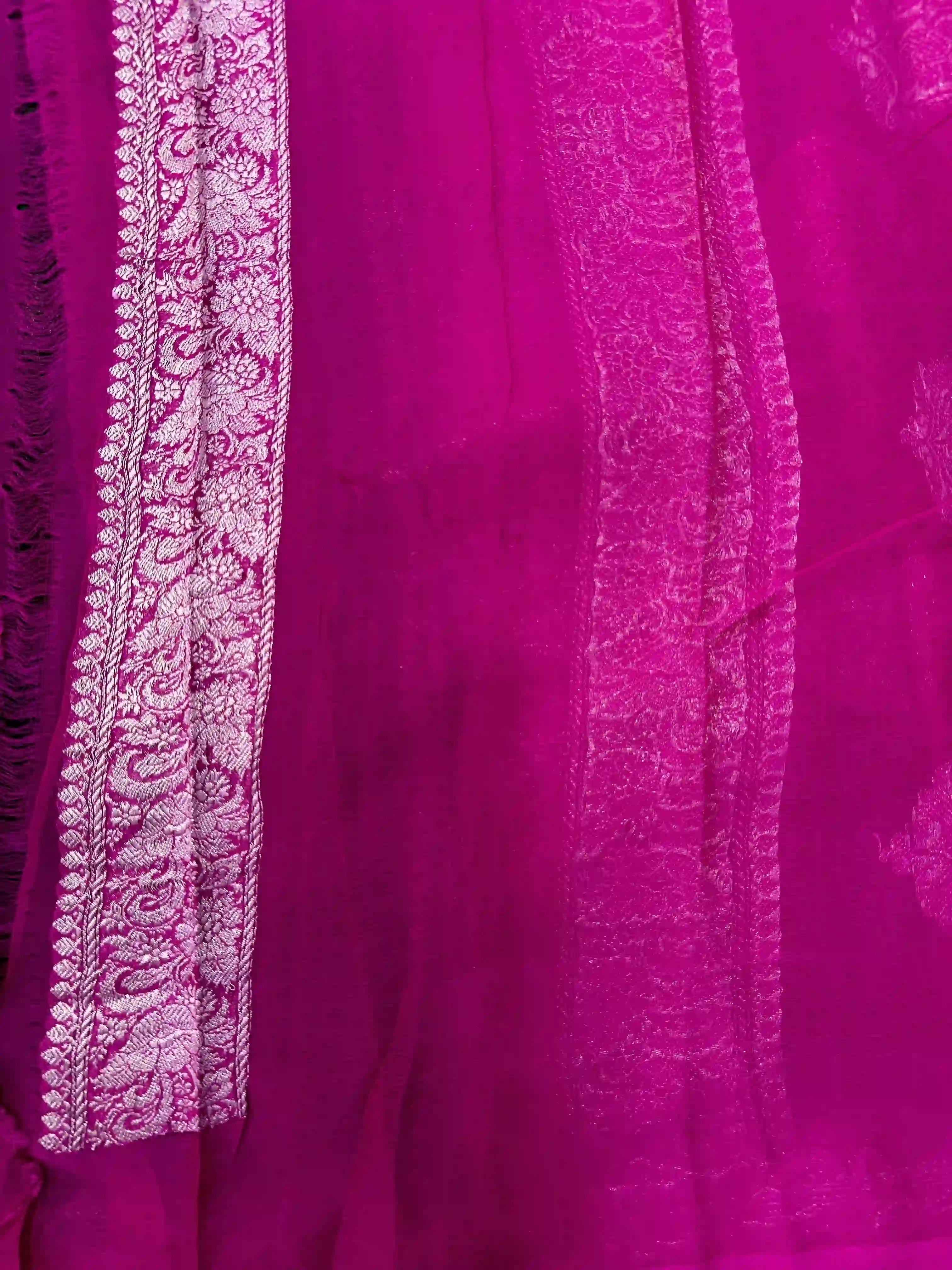 This Banarasi saree is made of luxuriously pure khaddi chiffon with a beautiful silver zari rust design. The contrast pink blouse and pallu are excellent finishing touches. Perfect for special occasions, its lightweight fabric guarantees long lasting comfort Intricately crafted with attention to detail, this saree is a must-have for any special occasion. The luxurious pure khaddi chiffon fabric and beautifully intricate silver zari rust design provide an elegant and comfortable look..