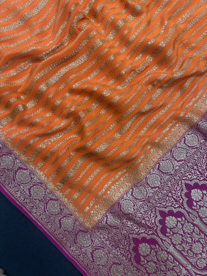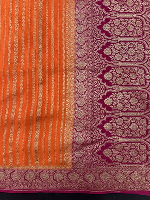 The Orange Pure Banarasi Saree is a vibrant and elegant choice for festive and wedding wear. Crafted from the finest silk, this saree features intricate handwoven zari work, with traditional motifs like paisleys, florals, and temple borders, adding a touch of grandeur. The rich golden zari enhances the brightness of the yellow, creating a striking contrast that makes the saree truly eye-catching. Its luxurious fabric offers a graceful drape and a flattering silhouette, making it perfect for celebrations, weddings, and special occasions. This saree combines timeless tradition with contemporary appeal, making it a stunning choice for any festive wardrobe.
