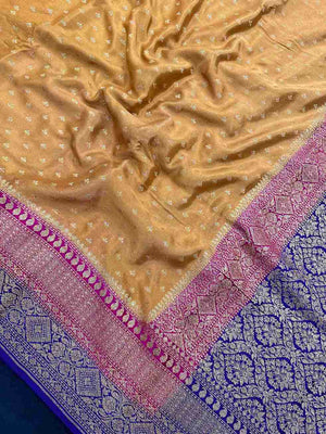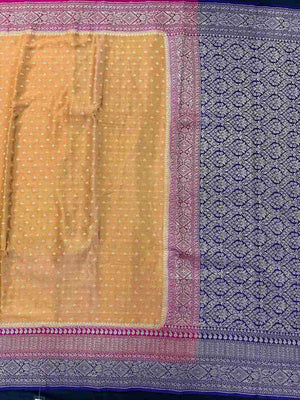 Take your fashion game to the next level with our Pure Banarasi 3D Crepe Silk Saree. The intricate 3D weaving technique creates a stunning visual effect, making this saree a true work of art. Crafted from only the finest quality silk, this saree exudes a timeless elegance that will never go out of style. Its luxurious feel and exquisite design will surely make you stand out from the crowd and make heads turn. Elevate your wardrobe with this must-have statement piece.