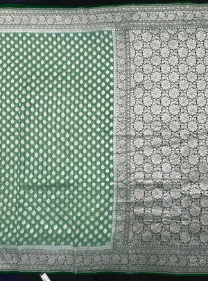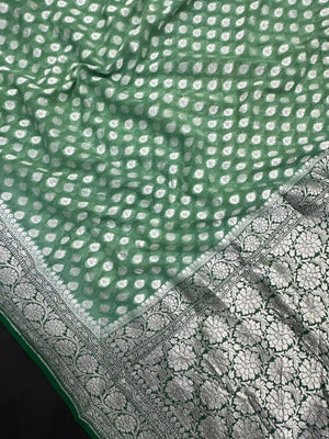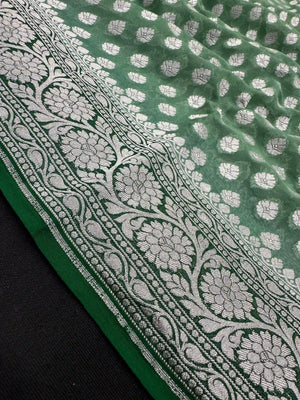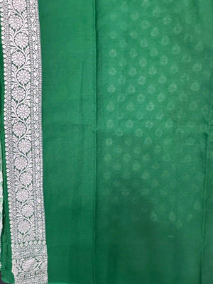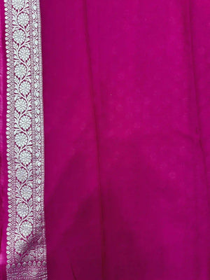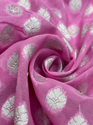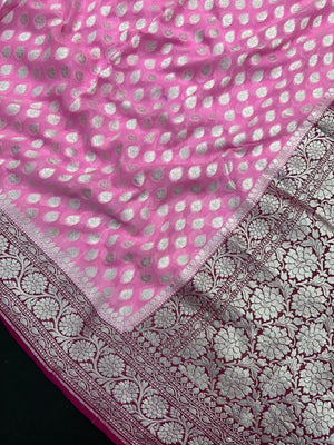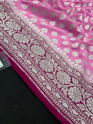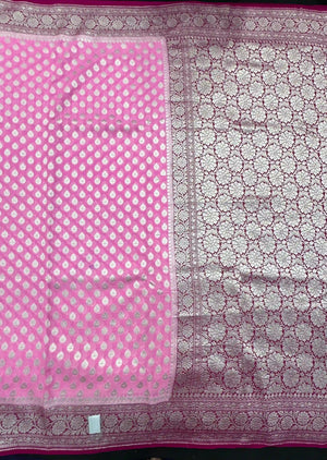 This Pure Banarasi Khaddi Georgette Saree is a classic example of traditional craftsmanship. Crafted from a lightweight yet durable fabric, this saree is woven with silver zari for a sparkly effect. The sky blue base, combined with the pink accents, gives the saree a stunning, sophisticated look. Perfect for special occasions.