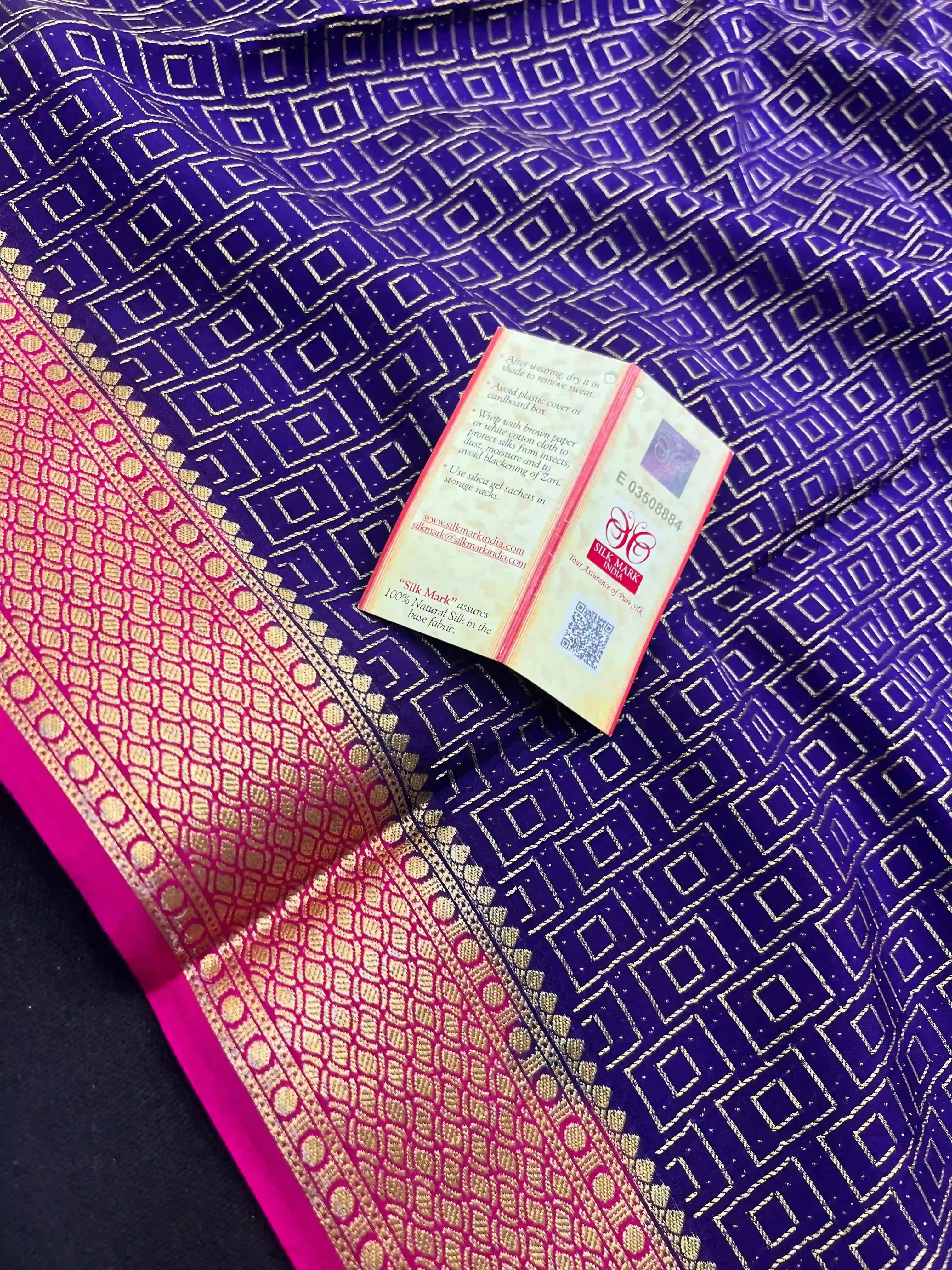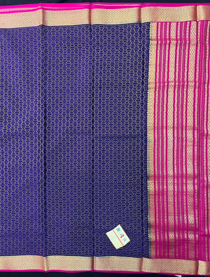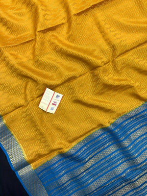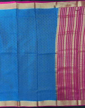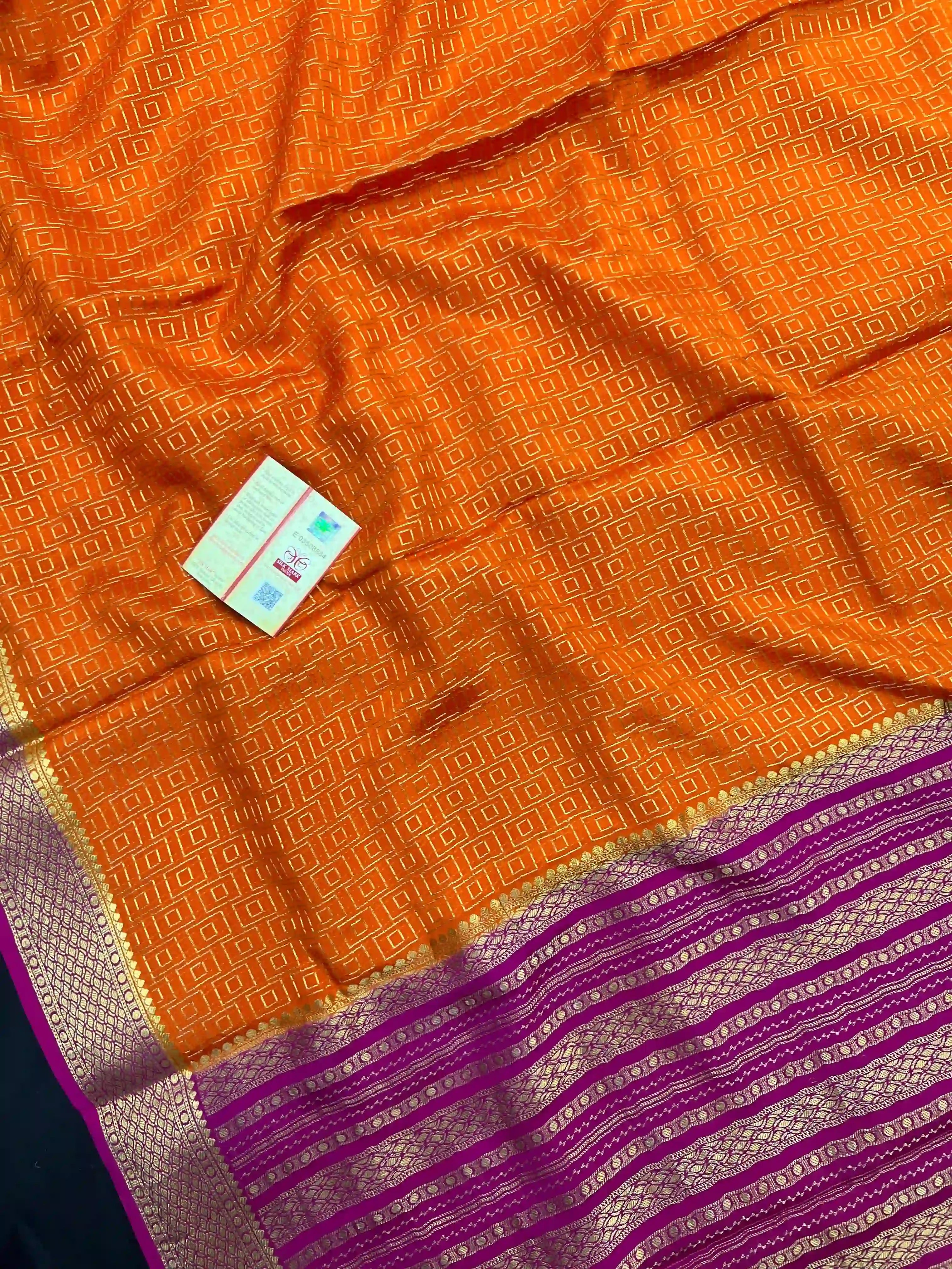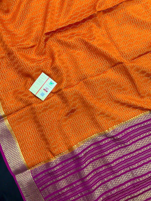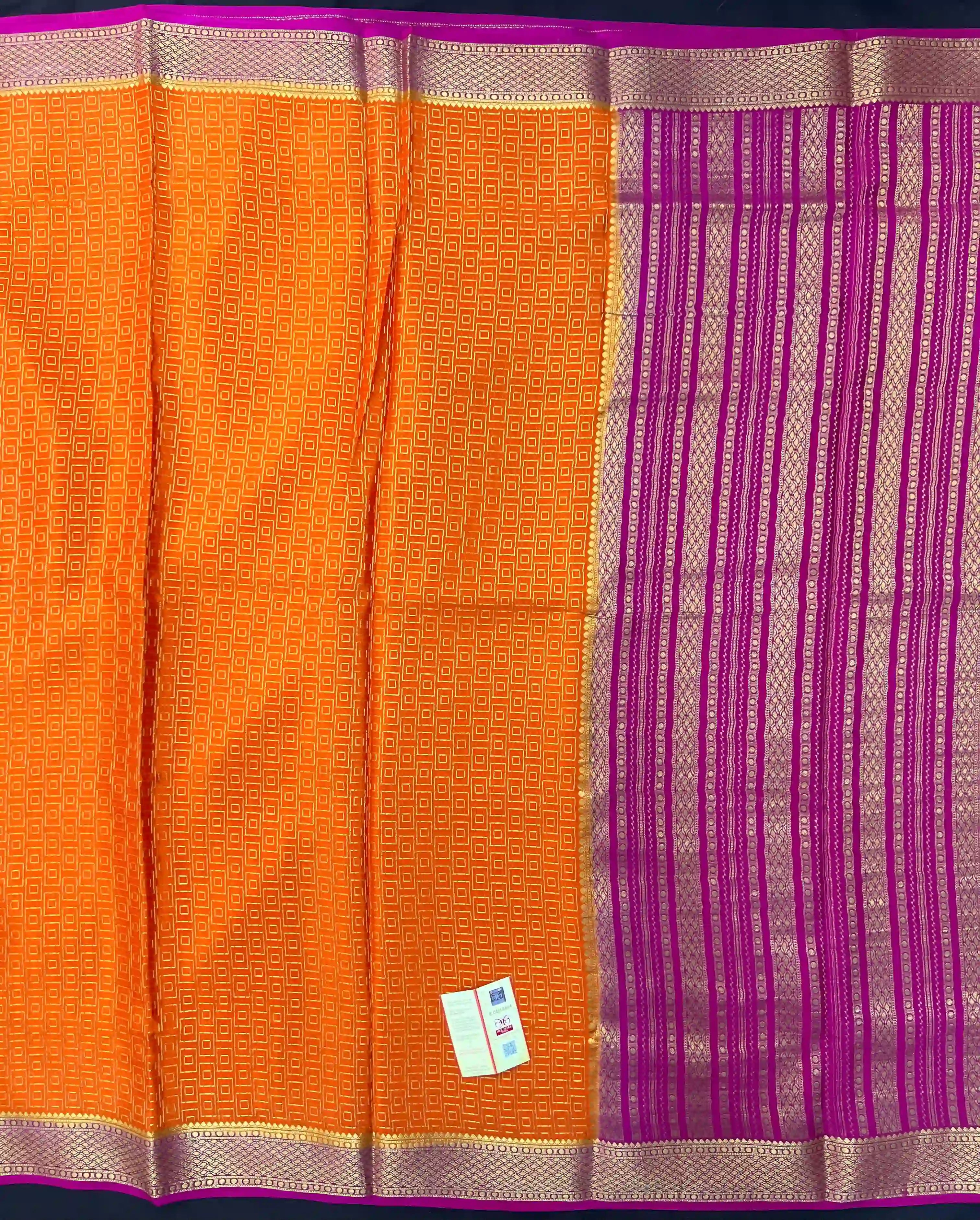 Crafted from high-quality Mysore crepe silk, this saree features traditional Bhanu checks, adding elegance and sophistication to any occasion. Perfect for draping in style, this saree is a must-have for any fashion-forward individual looking for a touch of tradition. Made with precision and care from the finest Mysore crepe silk, this saree showcases stunning Bhanu checks that enhance the overall look and feel. With its classic appeal, this saree is the perfect addition to your wardrobe for a timeless, yet stylish choice. Experience the luxury and grace of traditional fashion with this must-have saree.