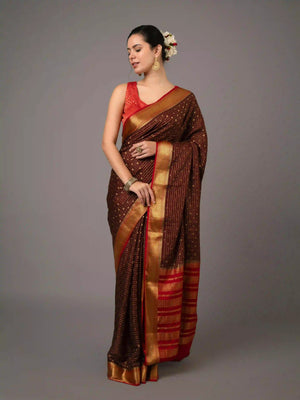 These luxurious sarees are made of pure Rohini Chex Mysore Crepe silk, known for its softness, durability, and elegant drape. Perfect for any occasion, these sarees offer a classic look with a touch of modern style. Experience the ultimate comfort and sophistication with Pure Rohini Chex Mysore Crepe Silk Sarees. Indulge in the unmatched elegance and comfort of Pure Rohini Chex Mysore Crepe Silk Sarees. Made from the finest quality of silk, renowned for its soft texture, durability and graceful fall. Whether it's a formal affair or a casual gathering, these sarees offer a timeless charm with a contemporary twist. Experience the allure of traditional Indian weaves combined with modern sensibilities, only with Pure Rohini Chex Mysore Crepe Silk Sarees.