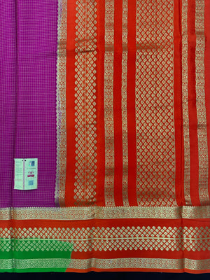Drape yourself in royalty with our Pure Mysore Crepe Silk Saree, known for its lustrous sheen, buttery soft texture, and graceful fall. Woven from genuine crepe silk, this saree offers unmatched elegance with a touch of South Indian tradition.
