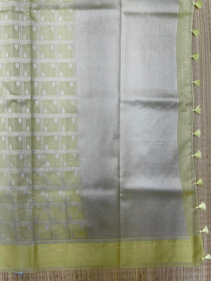 **"The Tissue Semi Banarasi Saree is a perfect blend of traditional craftsmanship and contemporary elegance, making it a standout piece in any ethnic wardrobe. Crafted from premium tissue fabric, known for its lightweight and lustrous texture, this saree offers an enchanting drape that flows gracefully with every movement. The saree is adorned with intricate Banarasi designs, adding a royal touch that reflects the rich heritage and artistry of Banarasi weaving.
